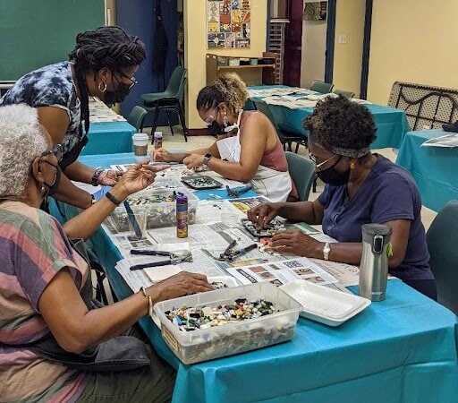 After two years of virtual workshops, we are welcoming new participants into our new space. With COVID protocols in place including masking, social distancing, and proof of vaccination or testing, we have our Beginning Mosaic workshops in session, led by artist instructor Bea Jones.