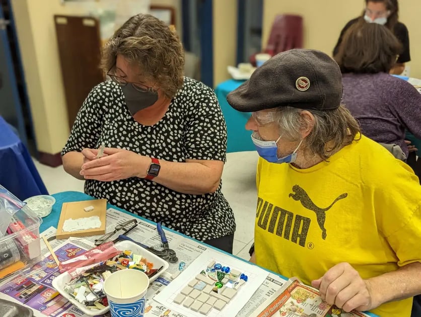She is right. Everyone had a great time, and Piece by Piece has a wonderful variety of recycled materials, the majority of it donated. In this project, we used repurposed white tile alongside bits of glass, ceramic, and dichroic pieces. Workshops like this allow everyone to try out different materials and see what resonates with them the most.
