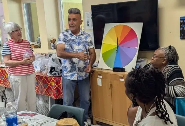 In a final session, the class had a little fun playing Wheel of Color where participants spun the spinner on a color wheel. Each artist then had to state the color; whether it was a primary, secondary, or tertiary color; and how the color is made—a mix or a primary. Every participant had an opportunity to join in. “Ellen emphasizes not to be afraid to experiment,” said artist June. And at every Piece by Piece workshop, we do just that: boldly experiment and develop both technical and creative skills.