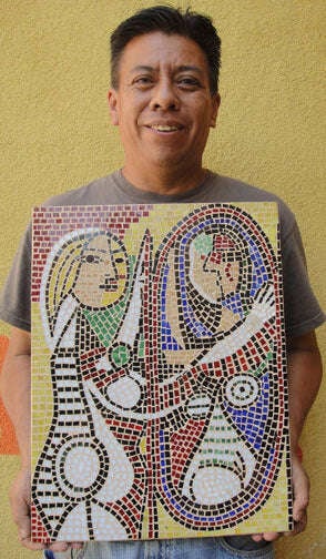 Jose M has been participating in the Piece by Piece program for almost five years. Before then, he had never tried mosaic art. His thirst for knowledge and his dedication to learning has shown through the development of his work. Jose has worked his way through our program and now participates in small and large commissions, including the Gower Public Art project and the Universal Discover A Star mural. In December 2012, Jose’s piece “Arbol de Vida” was accepted into an exhibit at the Los Angeles Arboretum. He took a chunk of a wood stump and created the artwork seen in the photo below. He cut the shapes, did the complete design and mosaic.
