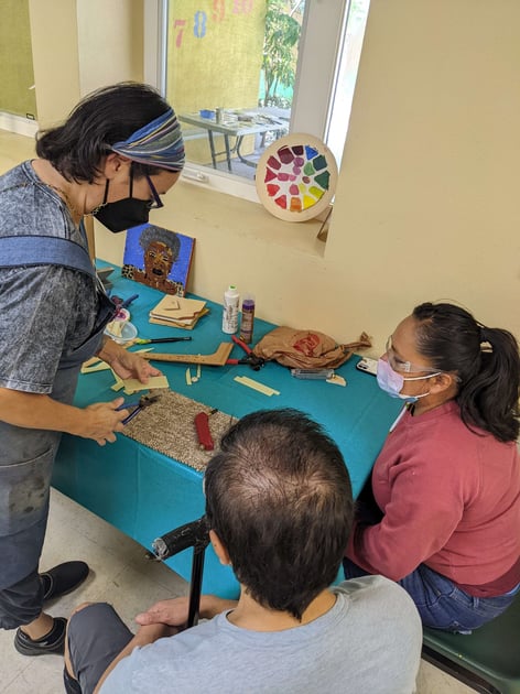 Program director Dawn showing new students different tools available for mosaic.