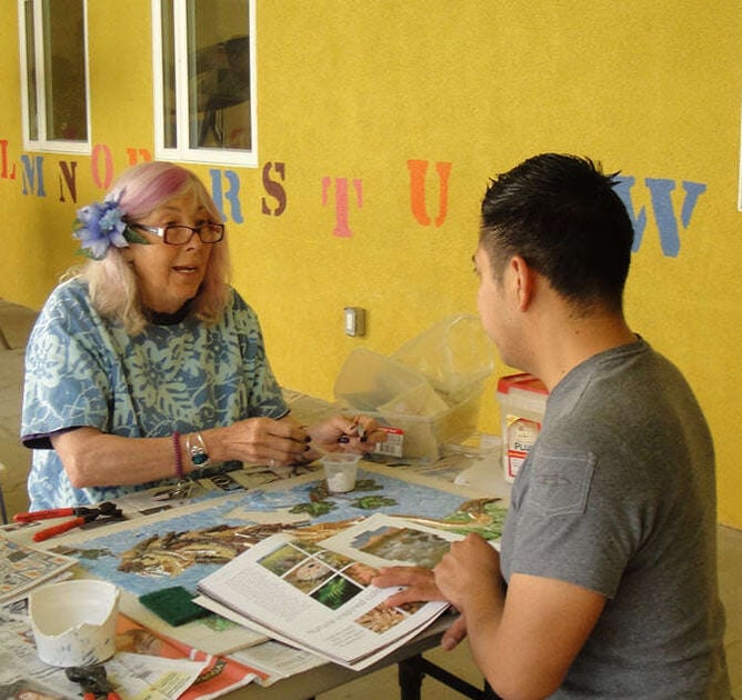 At Piece by Piece, Leigh teaches beginning workshops, cutting techniques, finishing techniques, and supports our larger commissions with her talents in cutting, clay forming and other specialties. She has a wonderful way of encouraging creativity, helping our participant artists to free themselves from inhibitions, and explore and develop their talents. She is also bilingual, and her fluent Spanish relaxes many of our ESL artists, who can express themselves more articulately through their own language.