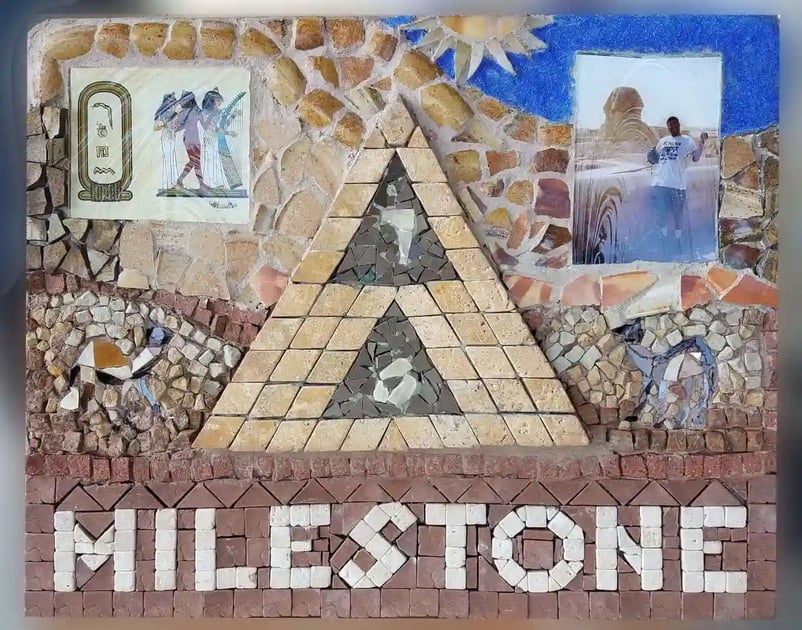 The impact our workshops have on our participant artists is both inspiring and empowering. Often, there is the discovery of something new about ourselves or an exploration of our past during the creative process. Our “Working with Natural Materials” workshop, taught by instructor Luz Mack, inspired Piece by Piece artist John, to create “Milestone” based on his own history. Not only did he enjoy his journey of creating and remembering his past achievements, but he found a new love for stone and natural materials, working with the traditional hammer and hardie, a tool used by ancient mosaic artists. Below is his narrative of the history and process of his work.