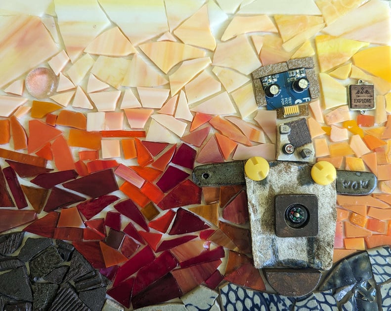 In May, artist instructor Julie Williams returned to teach a workshop using mixed media. The focus was on recycled materials including a variety of metal pieces to make mosaic robots. In addition to sparking creativity, this class also focused on proper adhesives to use for different materials. Metal can be a challenge in mosaic, but knowing how to incorporate it into a design can be a wonderful way to add curiosity and interest to a piece.