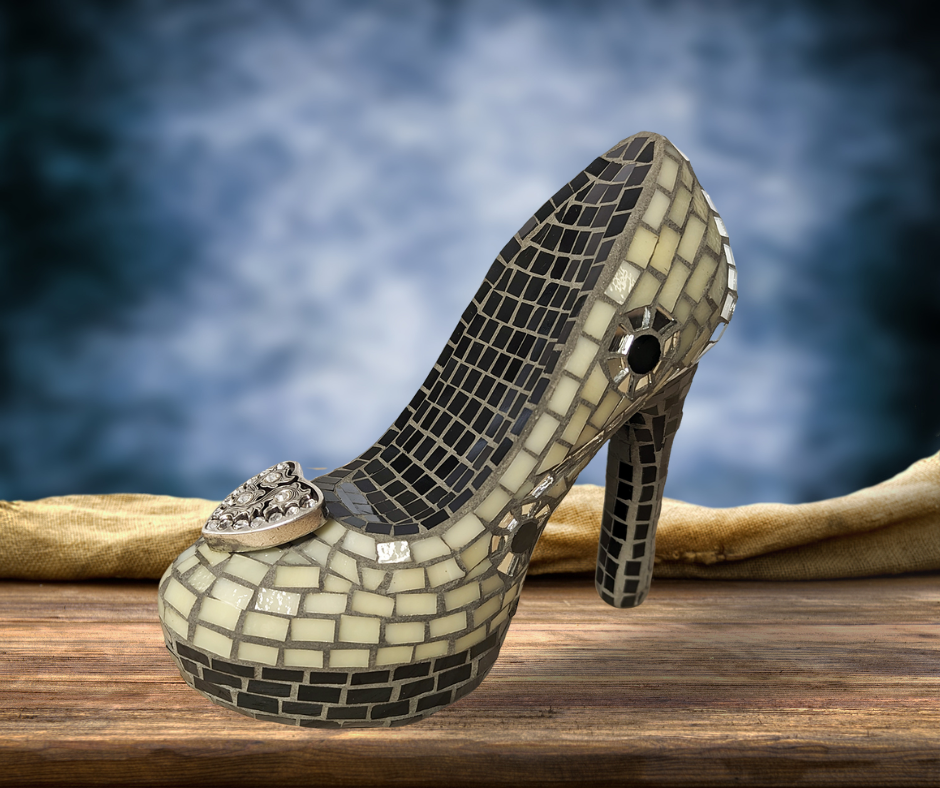 After the plaster has set, participant artists set about coming up with designs and applying mosaic to the shoes. Because of the complex shape of a shoe, the pieces need to be much smaller and intricate. Everyone took great joy in finding just the right adornments to accent their designs.