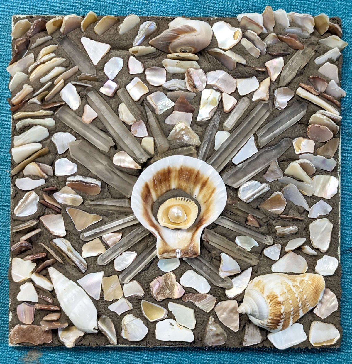 Piece by Piece started the new year by experimenting with a variety of natural materials including stone, marble, wood, seashells, and precious stones and minerals. This workshop was a part of our January theme of natural materials. Instructor Ellen Dinerman, brought the group back to mosaic roots, using a limited palette of muted and organic colors rich with texture. Some artists infused a bit of modern materials to add verve to their work.