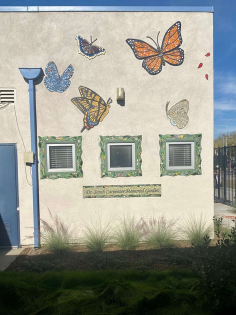 The Piece by Piece artist team recently completed a series of California Native mosaic butterflies for the Dr. Carpenter Memorial Garden, in honor of the late Dr. Sarah Carpenter, who was an inspiration as both a leader and a physician at the Sandy Segal Youth Health Center.