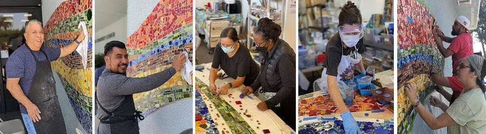 Piece by Piece artists (L to R): Jose; Victor; Instructor Luz with June; Vickie; and Instructor Luz with installer Juan