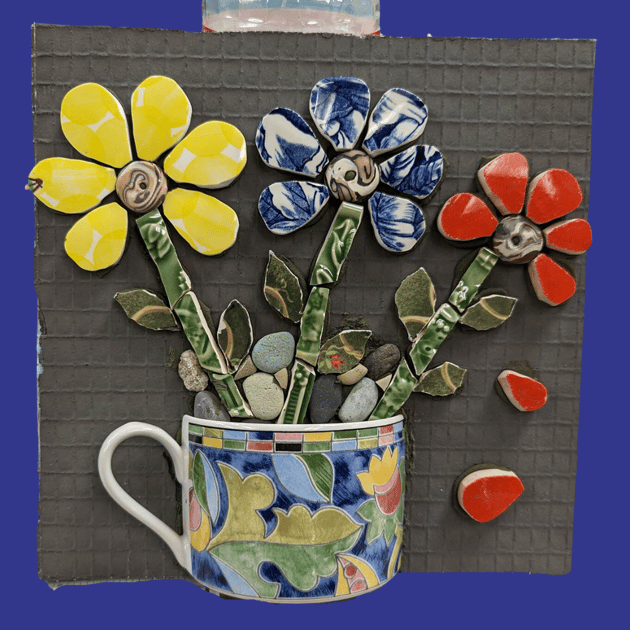 “Pique assiette is magical in that it invites both the artist and the viewer to envision new ideas in common materials,” said Dawn Mendelson. “A broken green plate becomes the leaves on a tree; a chipped vintage teacup holds a bouquet of ceramic flowers. The narrative is shifted from things unwanted to pieces that are celebrated.” The creativity of the artists in April’s workshops reflects this philosophy.