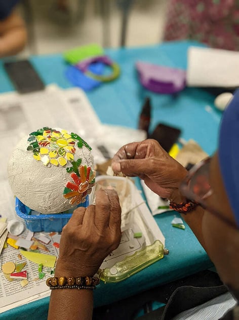 Working on a three-dimensional project has special challenges and rewards. “I learned that on a curved surface, you have to go with smaller pieces,” says artist John V. “That, and managing the adhesive is key.” For artist Kim, the process was a great new experience: “I really enjoyed making the sphere! For some reason, my cutting was better and everything just flowed easily. I liked the process.”