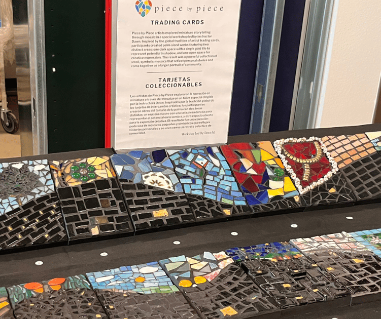 Displayed together, these ATCs formed an evolving tapestry of resilience, joy, and hope—a collaborative mosaic reflecting the courage, artistry, and unity at the heart of our community. Throughout the event, guests mingled with artists, learned the stories behind the art, and experienced the transformative impact of mosaic work at Piece by Piece.