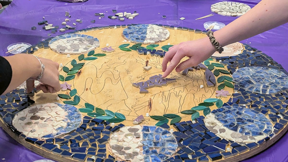 The students started by creating a vision board. They share that and some key images with, Piece by Piece Artistic Director Dawn Mendelson who translated their ideas into a mosaic layout that could be fabricated tile by tile. Her design honored the heart of the students’ original concept while adapting it into a durable, mosaic format that would look beautiful on campus for years to come.