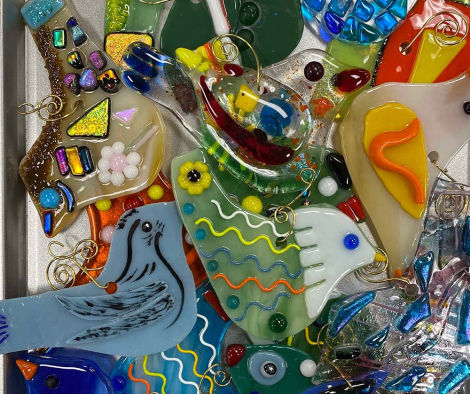 Every session offers hands-on learning: participants will discover a new fusing technique and complete projects such as bird plant stakes, butterfly suncatchers, one-of-a-kind pendants, vibrant fish ornaments, distinctive jewelry, spider web bowls, and imaginative melted bottle art. The process is engaging, accessible, and filled with opportunities for creative expression.