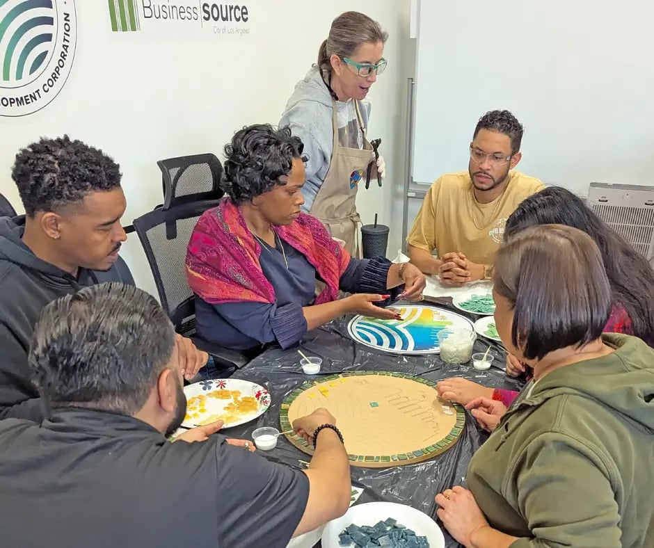 Employees were divided into five rotating teams, each having a chance to contribute to all four mosaic pieces. These included two mosaics inspired by the VSEDC logo, a bold “LA” design representing Los Angeles, and an Adinkra symbol for wealth and abundance, reflecting VSEDC’s mission to drive economic growth and provide access to capital in underserved areas of South L.A. Throughout the session, participants engaged with different teammates, exchanged ideas, and learned various mosaic techniques. From cutting and preparing materials to precisely placing each piece into the design, the process required patience, problem-solving, and teamwork.